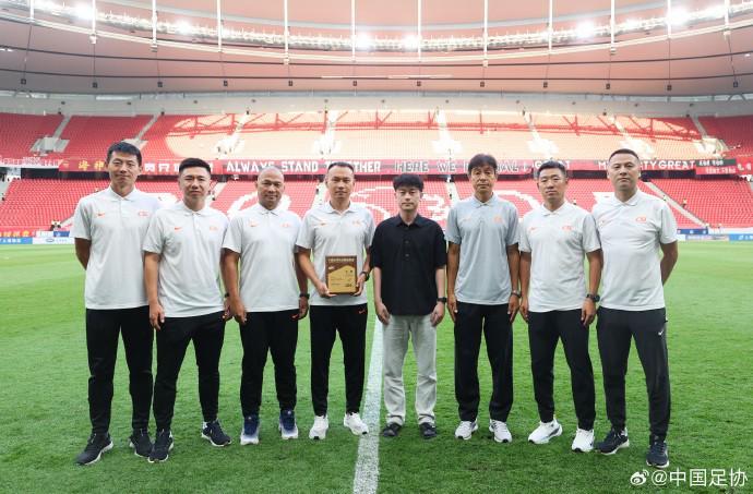 在比赛之前,中国足协向王竞颁发了执法中超联赛第100场赛事的纪念奖牌,本场比赛的裁判组也合影留念。